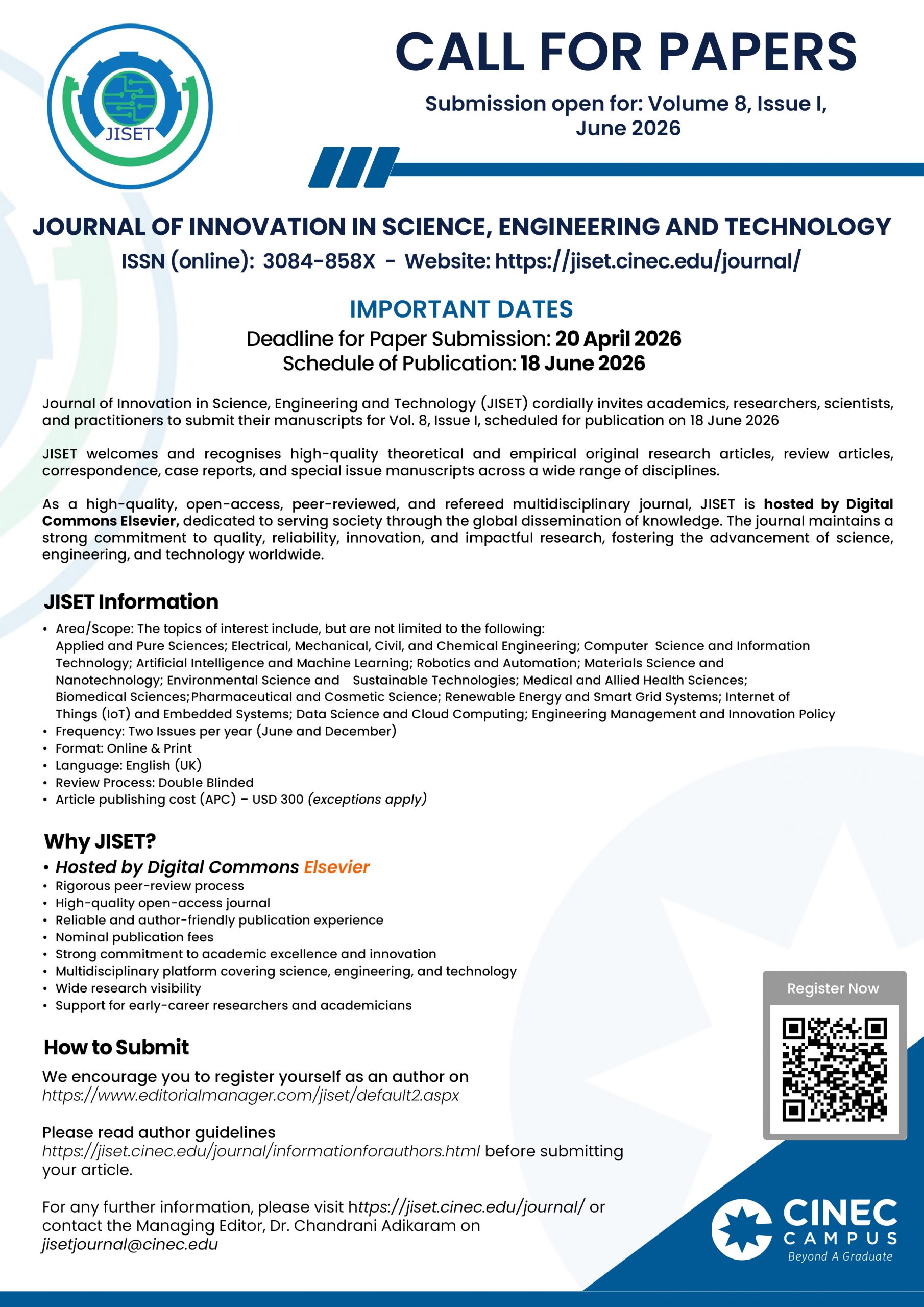 For any further information, please visit https://jiset.cinec.edu/journal/ or