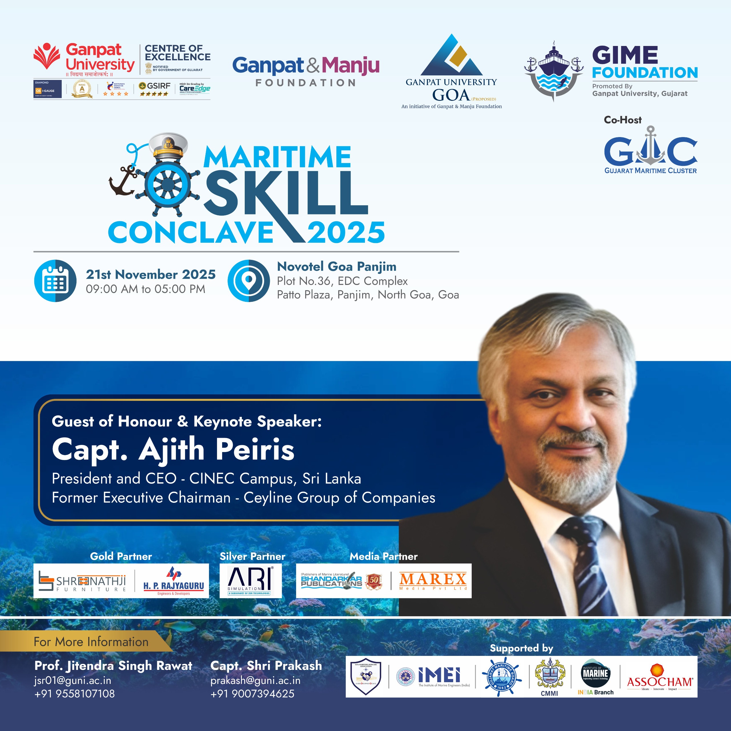 We are delighted to announce the successful conclusion of the Maritime Skill Conclave 2025, hosted by Ganpat University, Gujarat, India, on 21st November 2025 at the Novotel Goa Panjim. This significant event united regional and international leaders, policymakers, academicians, innovators, and aspiring maritime professionals to explore the future of skills, training standards, and transformative advancements in the maritime industry, with a remarkable contribution from our esteemed Keynote Speaker, Capt. Ajith Peiris.